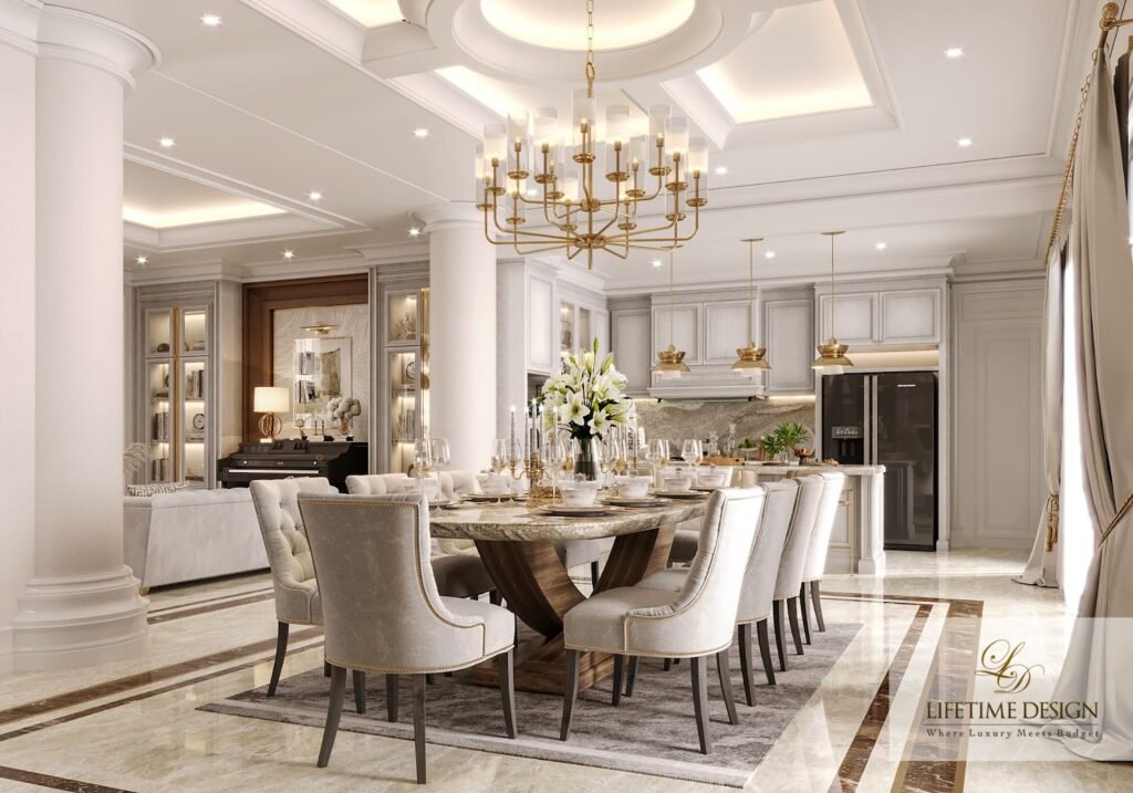 Meja makan besar berbahan marmer, kayu solid, atau kaca tempered dengan kaki logam berlapis emas mampu menghadirkan kesan berkelas. Kursi berlapis beludru atau kulit asli semakin mempertegas kemewahan.