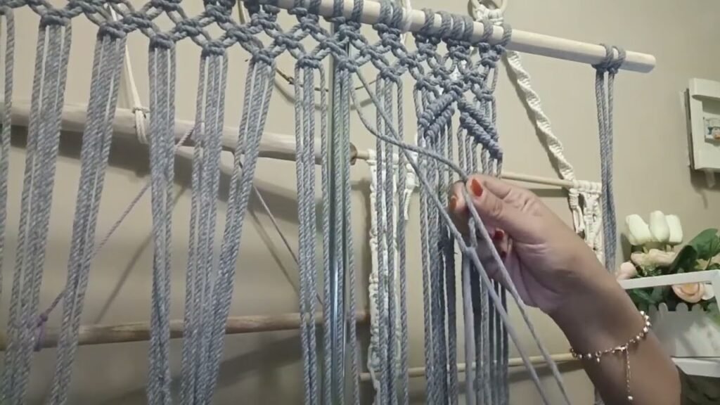 - Buat pola simpul sesuai desain (misalnya zig-zag atau diamond).